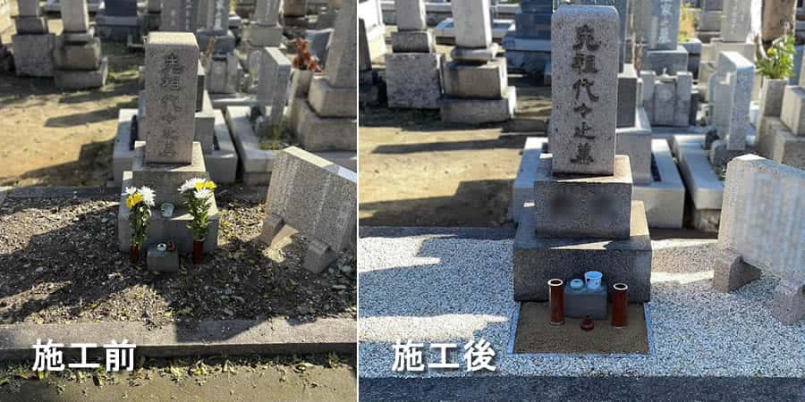 土間がきれいに整い、見た目もスッキリとした墓地になりました。末永く大切にお参りしていただければ幸いです。