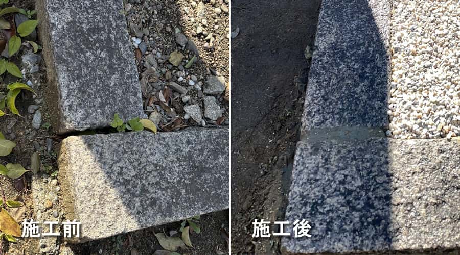 砂利がほとんど残っていない状態で、巻石にズレが生じて、隙間から雑草も生えていました。目地を補修し、雑草対策工事をします。
