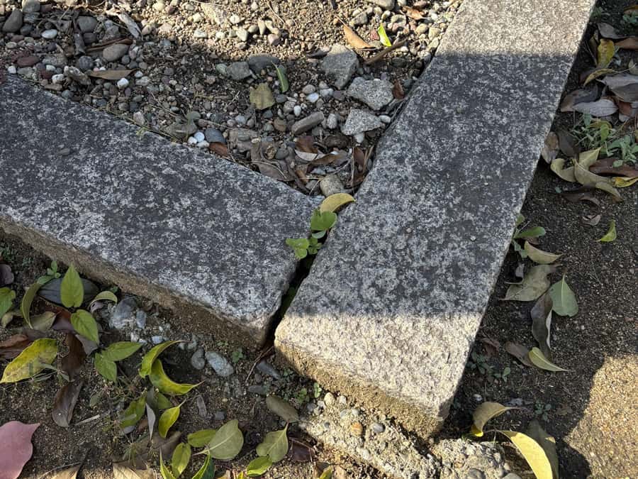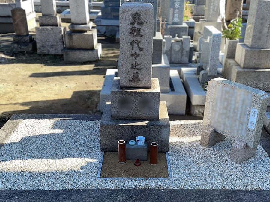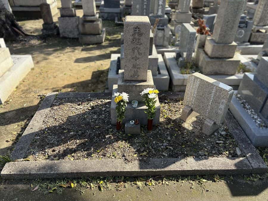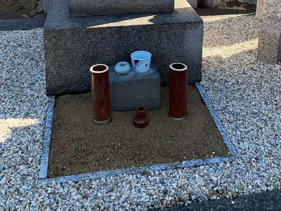 古いタイプのお墓なので、前の土の部分を掘り下げて地中に納骨します。そのために、敢えて土の部分を石で囲って残しています。