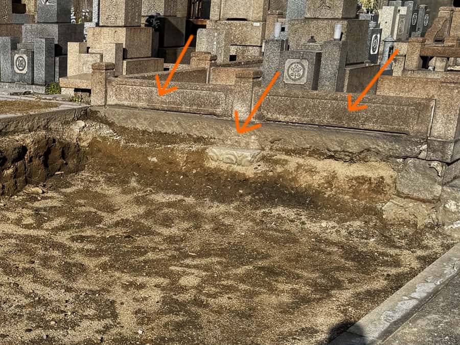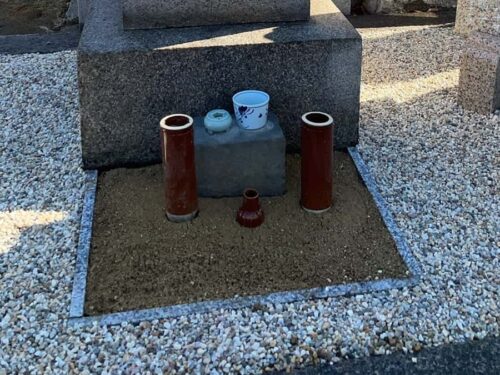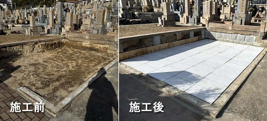 こちらが整備前の墓地の様子です。広い区画が更地になり、段差部分の補修と雑草対策も兼ねて石貼りにすることになりました。