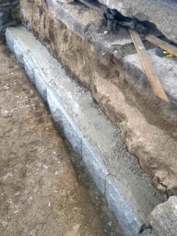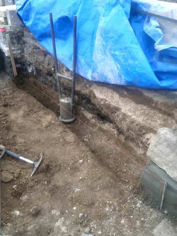 隣の区画が一段高い所にあるので、境界の段差部分がむき出しになっています。外柵部分の石(羽目板と下の延べ石)をいったん外して、その下に間知石で石積み工事をします。
