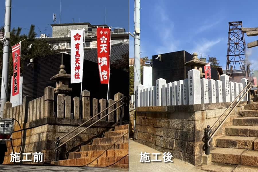 有馬温泉地区の有馬天神社にて、玉垣改修と鳥居の補修工事を行いました。