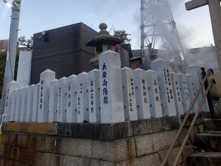 新しい玉垣の後ろに温泉の湯けむりが見えます。この玉垣の白い石も温泉の鉄分によって、これから少しずつ赤くなっていくのでしょうね。