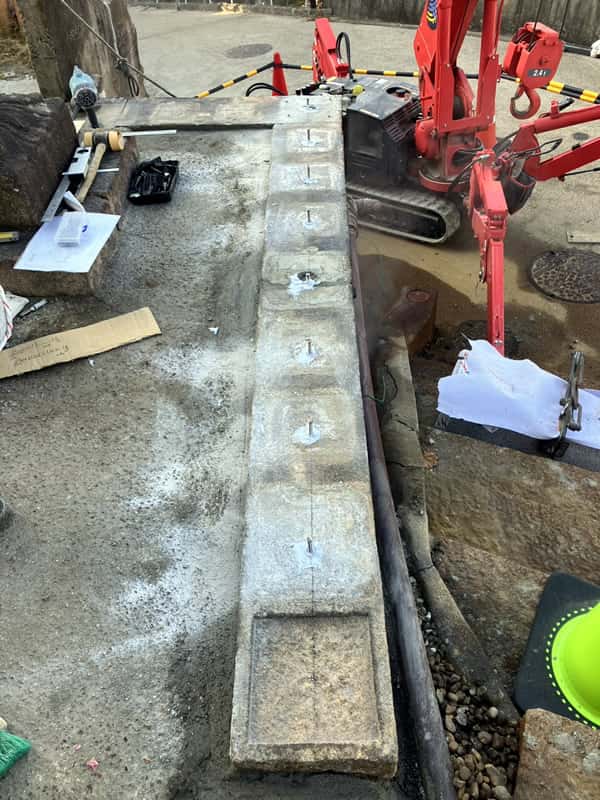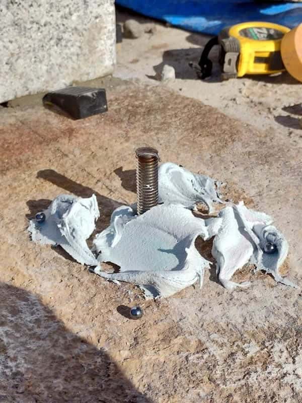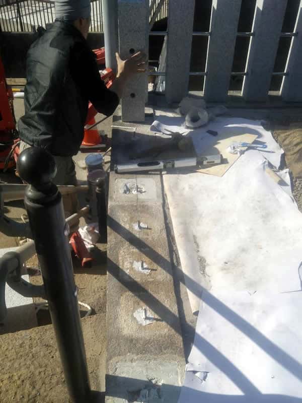 この上に石の柱を建てますが、柱の底に開けた穴に耐震用ボンドを注入し、ステンレス棒を差し込むことで強度を保つことができます。