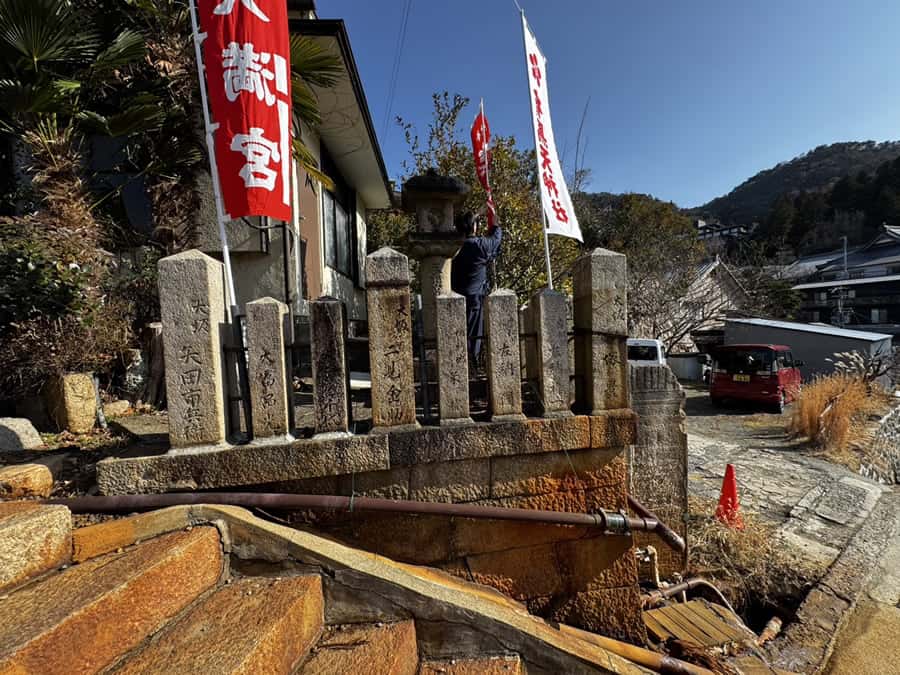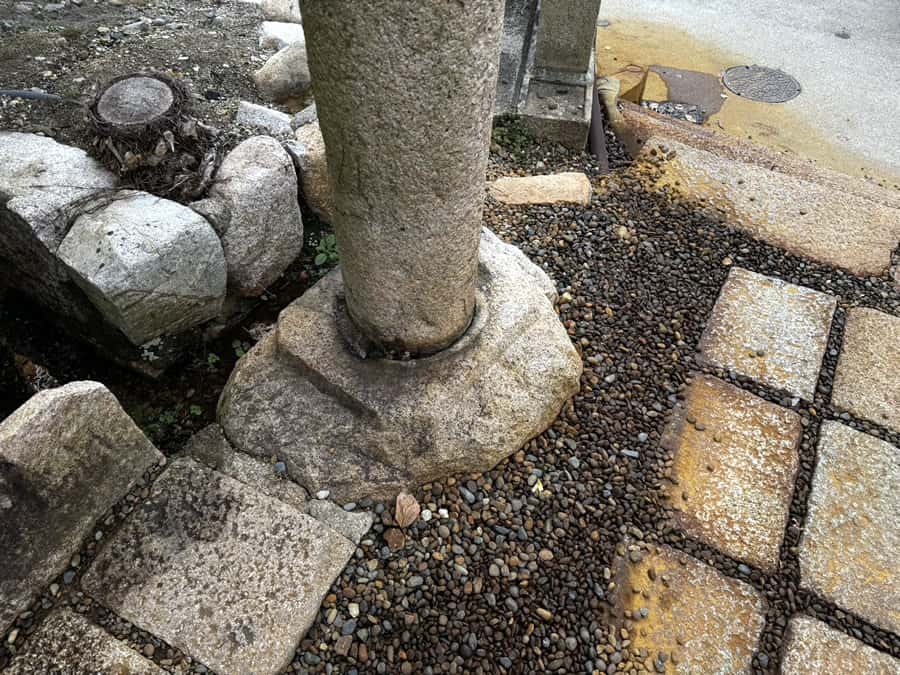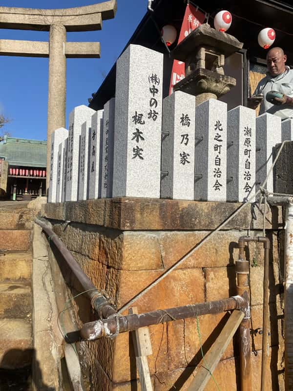 今回ご紹介させていただきますのは、神戸市北区の有馬天神社の玉垣改修工事、鳥居の修復工事の様子です。