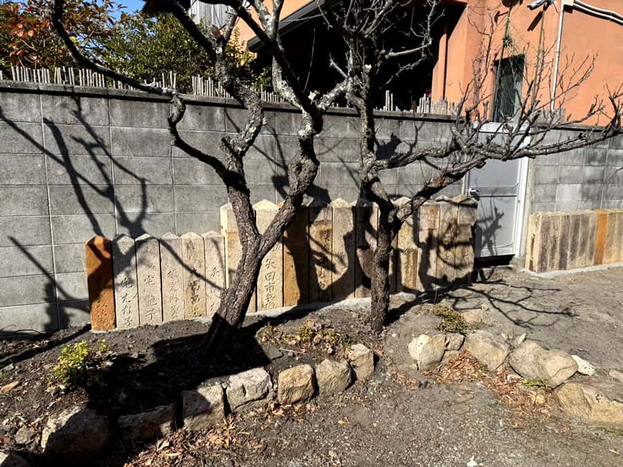 古い玉垣の石は境内の一カ所に集めて並べました。