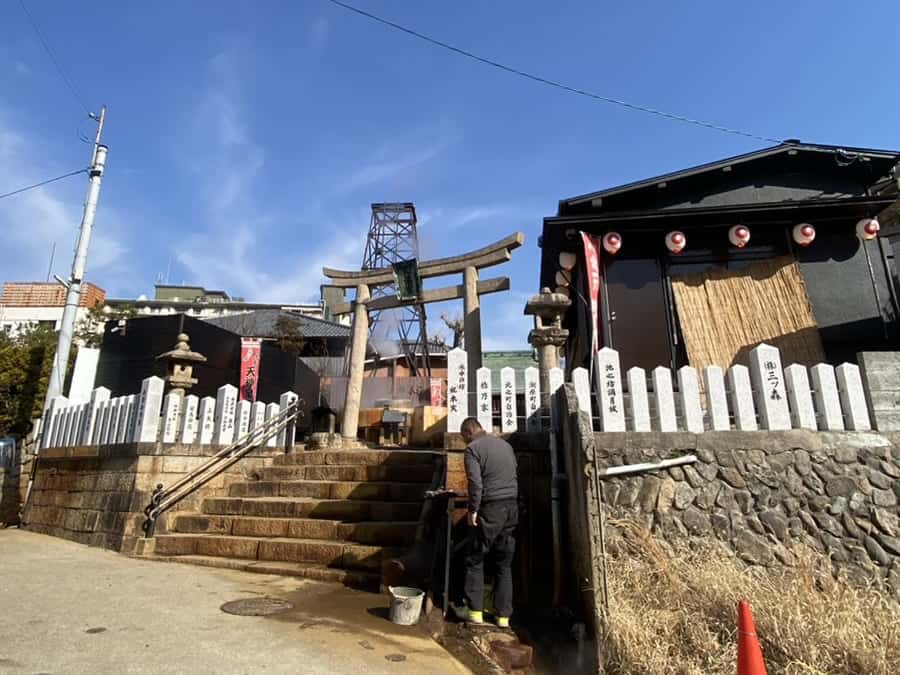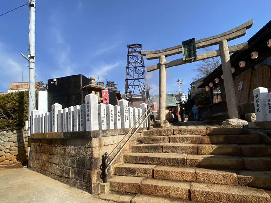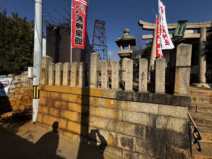 有馬天神社は有馬温泉のパワースポットの一つとして有名です。神社の境内には天神泉源があり、温泉が湧き出しています。石垣や石段が赤茶色になっているのは、お湯に含まれる鉄分の影響だそうです。