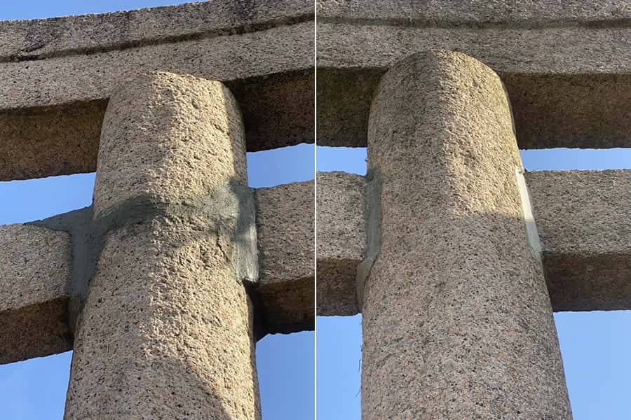 柱と貫の接合部分や額束の裏側など、石の継ぎ目やひび割れが生じている部分を補修します。