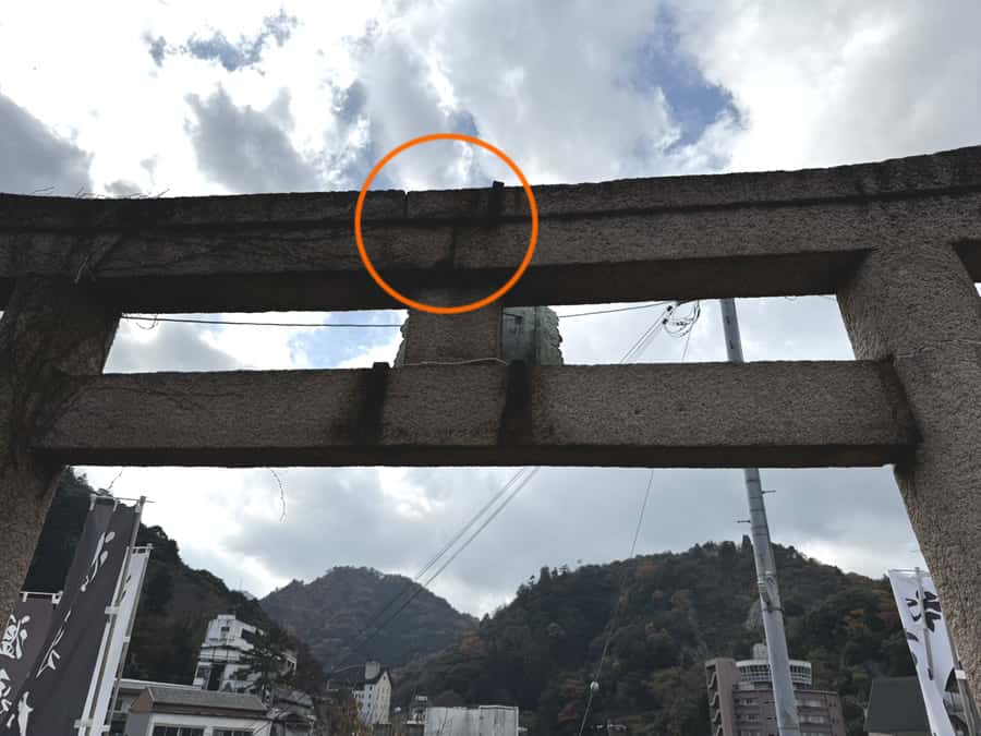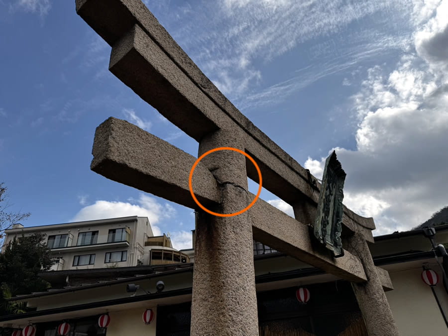 鳥居の補修中です。柱と貫の接合部分をチェックしています。