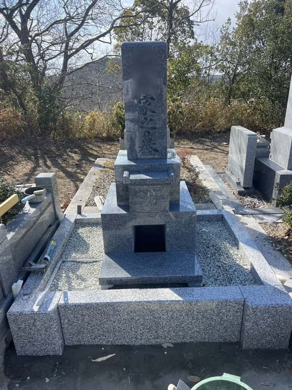 竿石を設置し、お墓らしくなってきました。納骨室の中には細かい粒の淡路砂利を敷いています。