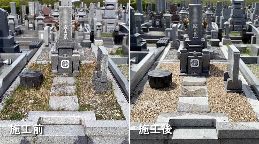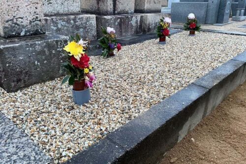 雑草対策には、「石貼り」「コンクリート+砂利」「コンクリート+レジンストーン」「防草シート+砂利」「雑草対策の固まる土(ジオミックス)」等々、いろいろな方法があります。墓地の状況やご予算、ご希望に合わせてご提案させていただきますので、お困りごとがございましたらいつでもお気軽にお問い合わせください。