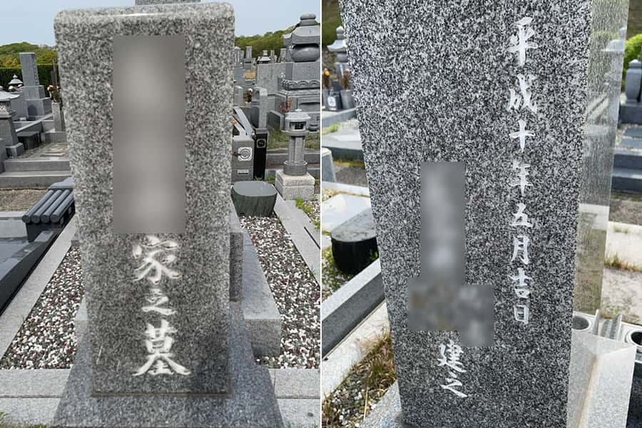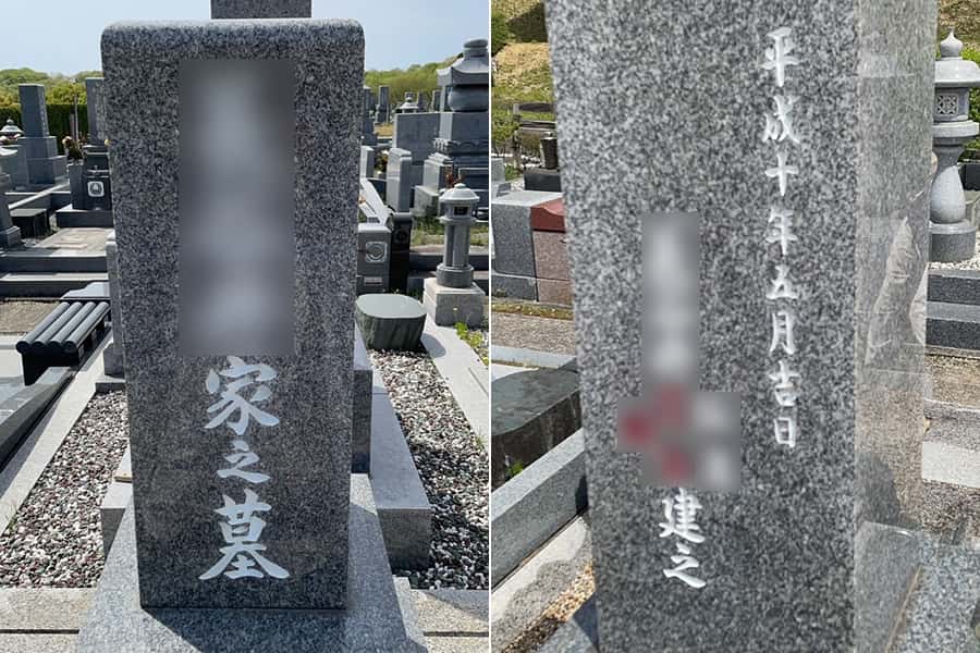 平成10年(1998年)に建てられた9寸神戸型の和型墓石で、文字の色がところどころ落ちています。特に建立者のお名前が読みづらくなっています。