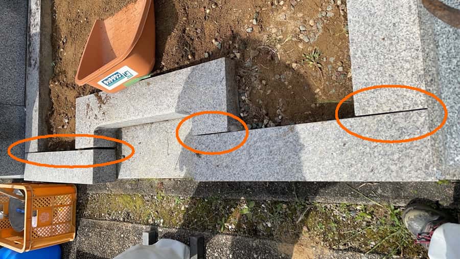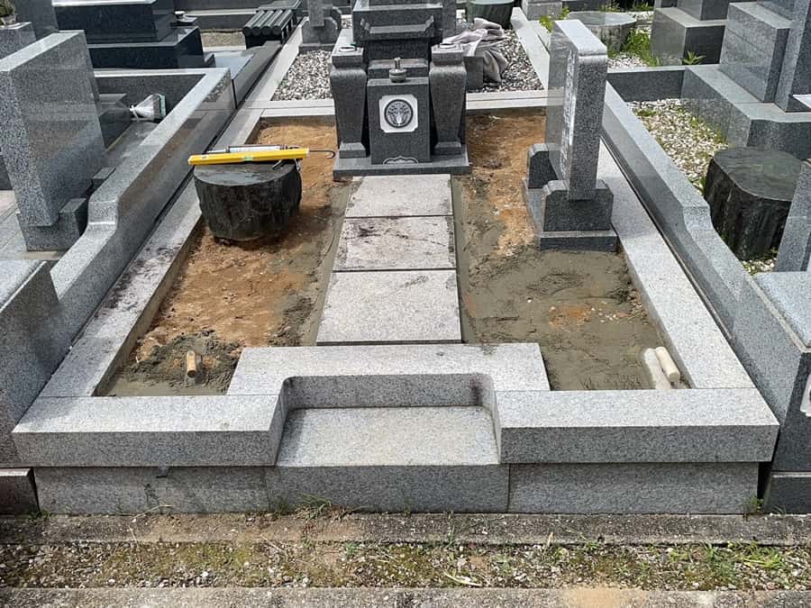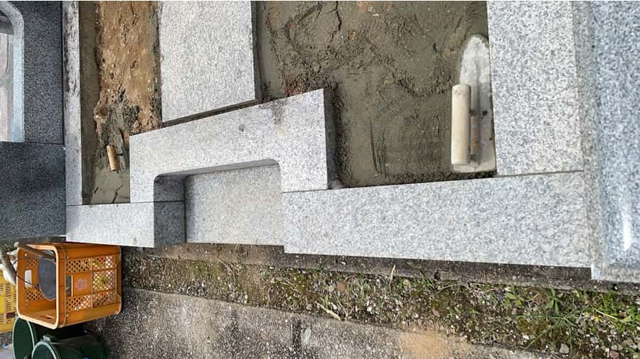手前の延べ石、物置石や拝石、霊標の周囲はコンクリートを打って補強しています。
