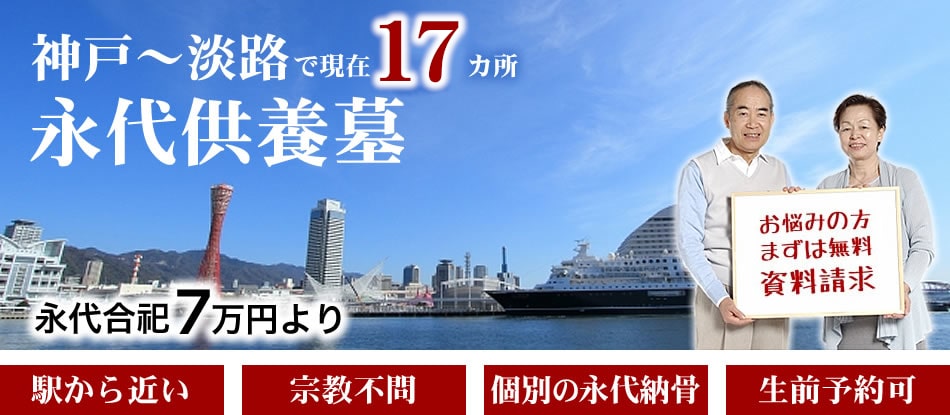 神戸市をはじめ、阪神エリアで永代供養墓、納骨堂をお探しの方へ。当店では、独自にご準備いたしました永代供養墓を神戸市、西宮市、尼崎市、淡路市など、計17か所をご案内いたします。