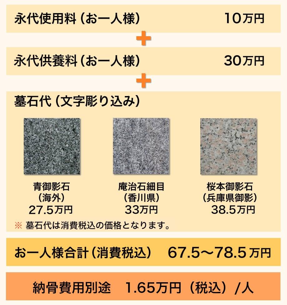 他の方と遺骨が一緒にならない、一般的な「個別納骨」に必要な費用は、平均で100万円ほどかかると言われています。「お墓は予算が・・・でも合祀はちょっとなぁ・・・」とお悩みのお客様にご好評いただいております。
