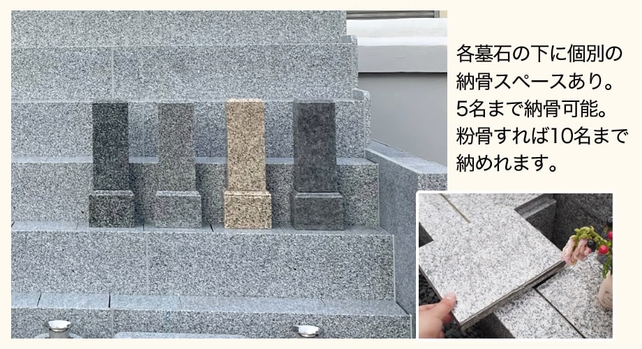 | 特長 | 普通のお墓と同じように、墓石があり個別の納骨スペースが用意されている。