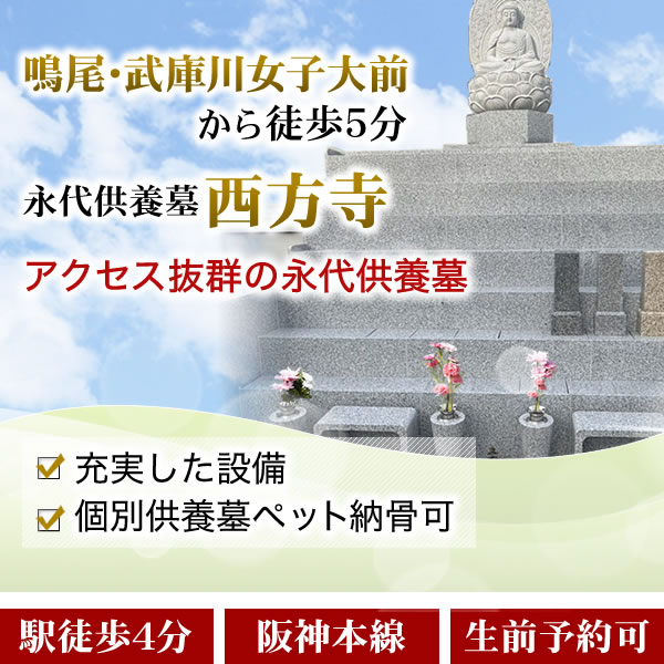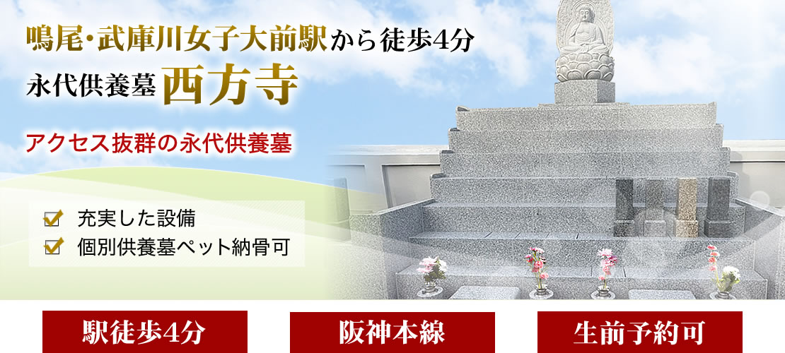 西宮市鳴尾町にある西方寺永代供養墓は、最寄駅である鳴尾・武庫川女子大前駅より徒歩4分の好立地にございます。宗教問わず、どなたでもお申込みいただけます。個別納骨、最初から合祀、とプランを選ぶことができます。